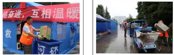 环卫工人们坚守岗位保障临时救灾点环境的清洁卫生