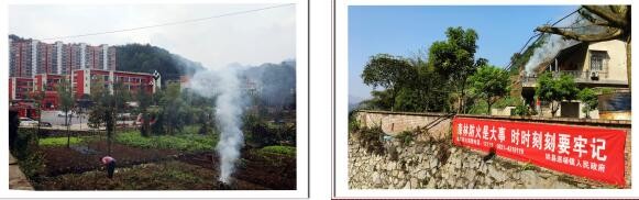 左图:2022年10月15日,在珙县消防救援大队门口村民烧起的浓烟就没有人管;右图:2021年3月23日,在巡场七角山下“森林防火是大事、时时刻刻要牢记”大红幅的左上方就有浓烟冒起。