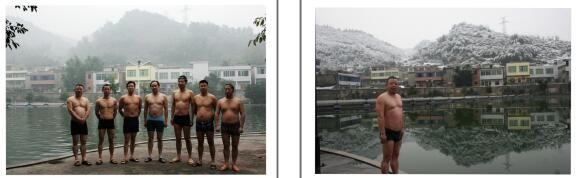 左图:2008年冬至留影;2008年2月2日上午8:33,巡场金龙公园背后山可以看到比较厚的积雪,我沿街拍摄了雪景后,在游泳池坚持完成每天的规定动作——冬泳。