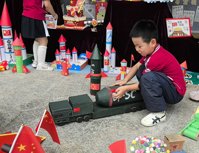 活动现场特设“亲子爱国主题手工展”区域,成为传递爱国情感的又一亮点。此前,家长与孩子共同围绕“祖国”主题创作手工:有的用彩纸剪贴出“五星红旗”,边角仔细折叠出整齐的纹路;有的用黏土捏制“天安门”“长城”,细节处尽显巧思;还有的将废旧材料改造为“小火箭”“军舰”,既环保又充满对祖国科技发展的自豪。