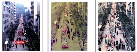 事前我就在想,如何拍摄出这盛况?穿梭在游行队伍中虽然让人看得眼花缭乱,大同小异的花车局部场面不能反映盛况特色,要抓大场面。于是,三步并作两步朝着人民大桥下面方向跑,争得附城乡卫生院服务台人员的同意,一次两级阶梯快步蹿医院大楼四楼楼顶,在围墙边选好位置,总算拍摄到长长的游行队伍,但失去机会随车拍摄到巡场沿线的场面。