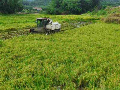 10月13日下午,雨后天晴,江安县老科协位于夕佳山镇文武村的“中稻+再生稻”机械化高产示范项目——25亩再生稻在轰隆隆的机收声中迅速抢收完毕。由于近期雨水较多,再生稻稻秆多数已形成45度倾斜,机收难度增大。下午3点半钟时,大雨骤停,天空放晴,艳阳高照,大型收割机下田开机收获。