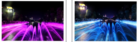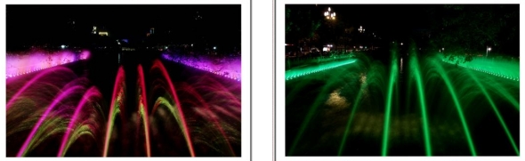 伴随着优美的音乐和变化的灯光一簇簇水花也变换着颜色