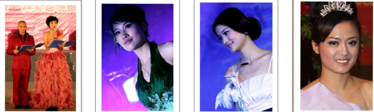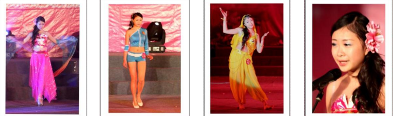 图(1)→主持人罗君(左)、谭丽莎(右); 图(2)→茶花仙子叶平(最佳聪慧) ;图(3)→茶花仙子程雪(最佳形象) ;图(4)→茶花仙子何蝉(最佳才艺) 。