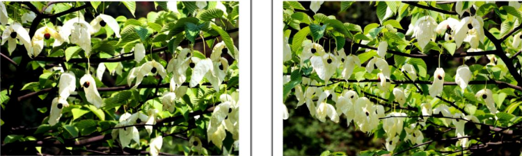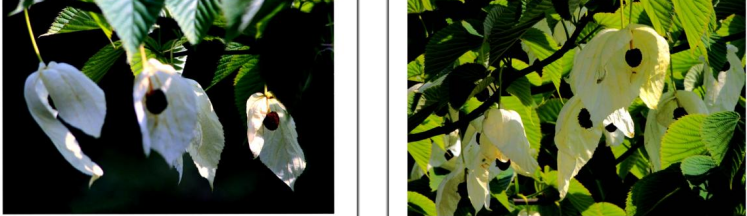 珙桐树盛开繁花,它的头状花序下有两枚大小不等的白色苞片,呈长圆形或卵圆形,长6~15厘米,宽3-8厘米,如白绫裁成,美丽奇特,好像白鸽舒展双翅;而它的头状花序像白鸽的头,珙桐有“中国鸽子树”的美称。