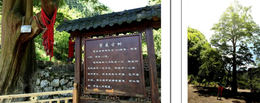 据介绍:古老而神秘的“紫薇古树”树龄为1000余年,树高43米,胸径1.63米。紫薇树每年6月。脱皮一次,树皮对皮肤病有一定的疗效。树底有一个小洞,洞内有水,并且常年不干涸,也不会外溢。该水经有关专家鉴定可以饮用,有益人体健康。