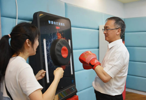 杨剑一行在白塔中学副校长冯涛和工会主席王昌明的陪同下实地察看了学校心理咨询中心的功能室与硬件设施,仔细查阅了相关档案资料,现场观摩了两位心理老师执教“山水减压”“沙盘游戏”两种不同形式的团辅活动课,并在心理宣泄室亲自体验了拳击游戏,称赞学校心理健康教育活动形式多样,内容丰富。