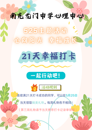 为广泛宣传与普及心理健康知识,丰富学生校园文化活动,进一步推进学校心理健康教育工作,促进学生健康阳光成长,近日来,南充龙门中学开展了“5.25”心理健康月系列活动。