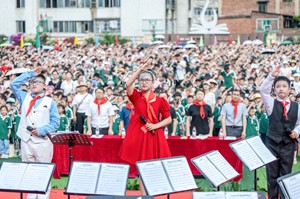 2023年5月31日, 四川省华蓥市双河小学的师生在“学习二十大,争做好队员”校园艺术节闭幕汇演暨六一表彰活动上表演大合唱“没有共产党就没有新中国”。