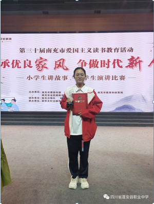 6月2日,第三十届南充市爱国主义读书教育活动“传承优良家风,争做时代新人”小学生讲故事、中学生演讲比赛在南充高中临江校区举行。四川省蓬安县职业中学2021级计算机3班田苏琪同学代表蓬安县中学生与来自全市各县市区选拔出的13名学生同台竞技,取得第三名的好成绩,获得“二等奖”。