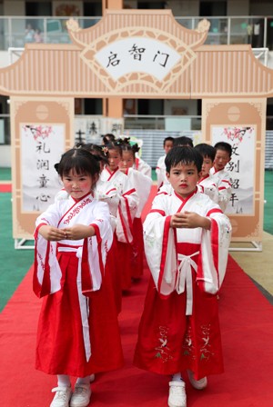 2023年6月27日,在四川省华蓥市杜家坪幼儿园举办的“礼韵国风·雅颂童年”为主题的毕业典礼上,大班的小朋友从启智门走出。