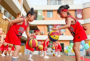 2023年6月27日,在四川省华蓥市杜家坪幼儿园举办的“礼韵国风·雅颂童年”为主题的毕业典礼上,大班的小朋友在参加花式篮球表演。