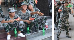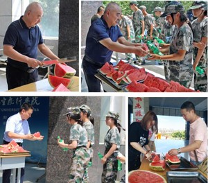 学校为军训师生和教官准备了清凉解暑的水果和饮品。李正春带领大家一起切西瓜、发饮品,将一牙牙鲜甜的西瓜、一瓶瓶清凉的饮品逐一分发到每一位同学、教师和教官手中。