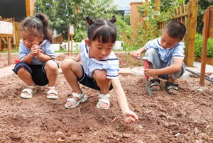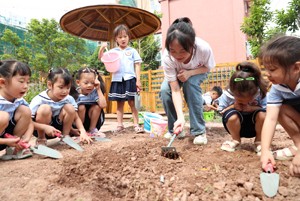 2023年9月1日,四川省华蓥市杜家坪幼儿园的老师带领小朋友在小菜园松土, 准备播种秋菜,让小朋友学习秋种秋播等农事,上好开学第一课。