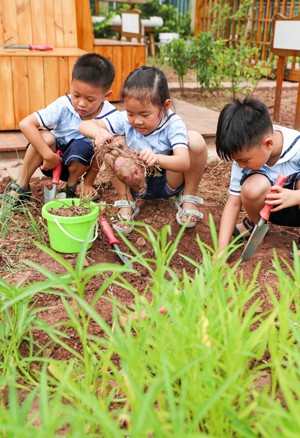 2023年9月1日,四川省华蓥市杜家坪幼儿园的小朋友在小菜园收获红薯,准备换种秋菜,上好开学第一课。(邱海鹰 刘南贤)