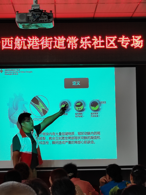 本次培训会由街道老年人协会副会长高力主持,应急救护是一项十分重要的社会责任和担当,每个人都要认识到自己在应急救护的重要性,积极学习,掌握和运用应急救护知识和技能,为社会的和谐稳定贡献自己的力量。来自双流区红十字会的专业老师熊天奇老师利用PPT、以图文并茂的形式生动展现了意外事件(烧烫伤、鼻出血)的预防和救治,急性冠状动脉综合征、脑中风的特征和预防处理和注意事项,把应急救护的相关知识和技能传授给大家,让参会人员更加全面了解和掌握了卫生急救知识和技能。