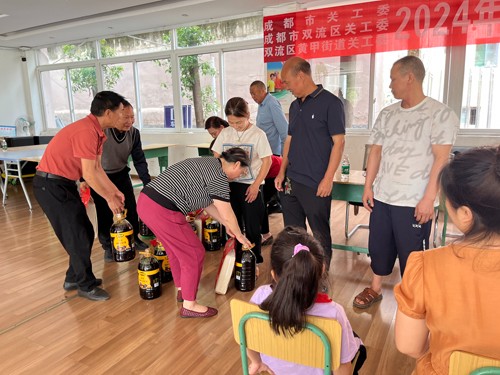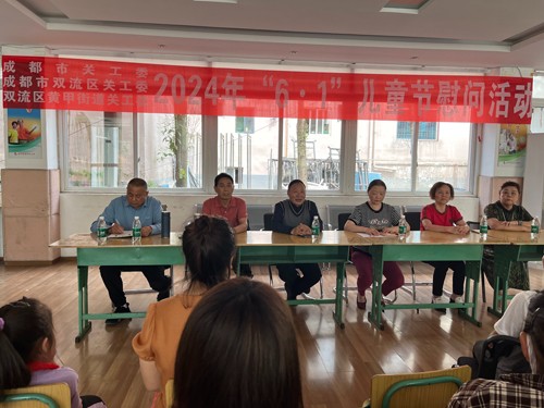 此次慰问活动由黄甲街道关工委常务副主任付仕水同志主持,他说“6.1”儿童节就要到了,首先祝你们儿童节快乐!今天我们各级关工委在这里对大家开展一次节日的慰问活动,体现了我们对你们的关怀,希望你们不辜负关工委爷爷奶奶对你们的期望,好好学习天天向上!在老师的教育培养下在德、智、体、美、劳各方面全面发展,使自己成为可靠的能担当重任的可靠接班人,慰问组组长双流区关工委常务副主任吴显富在慰问时作了讲话,他说:“6.1”儿童节即将到来,今天我们带着党委政府的关怀、带着成都市关工委、双流区关工委的一片心意,来到这里慰问黄甲街道的少年儿童,来看望慰问你们,首先祝少年儿童们“6.1”快乐!希望你们爱党爱国好好学习在德智体美劳方面都得到发展,锻炼好身体、在家做好孩子、在校做好学生、在社会做个好少年、将来成为社会主义建设事业的可靠接班人!讲话毕,关工委的爷爷奶奶们为14位儿少年儿童送上了慰问金、大米、油等物资,此时同学们非常感动,纷纷表示,要好好学习,用优异的成绩向爷爷奶奶汇报,长大了一定好好报效祖国,为建设祖国出力,最后全体人员一起合影留念。(付仕水)