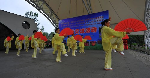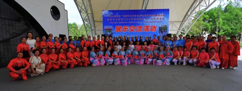 伴随着悠扬的音乐,太极拳协会的《太极功夫扇》拉开了本次活动的序幕,接下来《没有共产党就没有新中国》、《时代感》《中华通络操》等25个节目依次上场展示交流。本场活动有广场舞、中华通络操、柔力球、太极拳(扇)、健身秧歌、健身球操、空竹等体育健身项目的展示。精彩的节目、整齐的动作和丰富的内容赢得了现场观众的阵阵掌声。