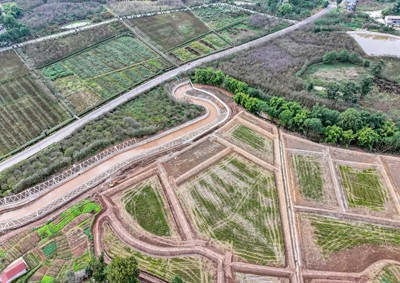 2024年11月14日,鸟瞰四川省华蓥市禄市镇凉水井村即将全面竣工的高标准农田建设和溪河治理工程。