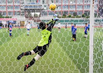 2024年11月15日,四川省华蓥市参加中小学生校园足球决赛小学组的守门员,在赛场奋力扑球。