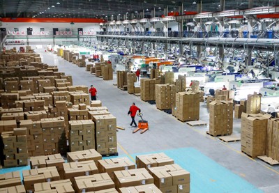 2024年11月20日,四川省广安华蓥市华蓥山经开区瀚海精密电子厂的的员工,在智能车间转运包装好的产品,加速度冲刺全年目标。(邱海鹰)