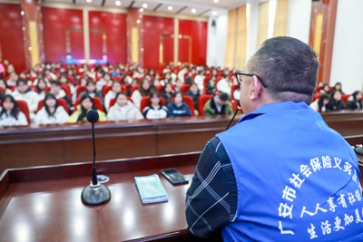 2024年11月22日,四川省广安市社会保险局的“社保蓝”义务宣传员,在广安职业技术学院向学生宣讲社保知识。