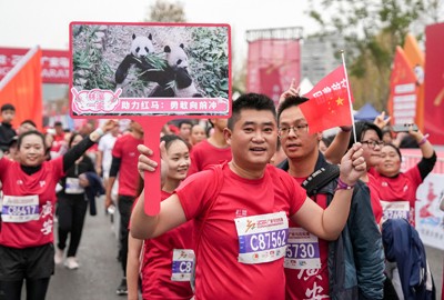 2024年11月23日,四川省广安市一位市民举着大熊猫“林溪”、“一家”的标牌参加2024马拉松欢乐跑。