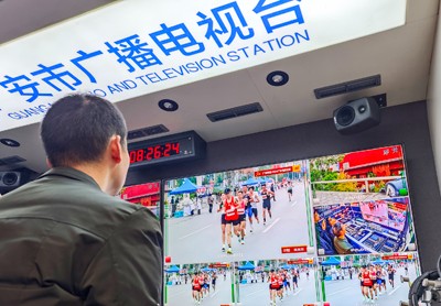 2024年11月23日,四川省广安市电视台的工作人员在现场直播2024马拉松比赛。