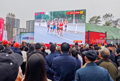 2024年11月23日,四川省广安市市民通过街头的大屏幕观看2024马拉松比赛直播。