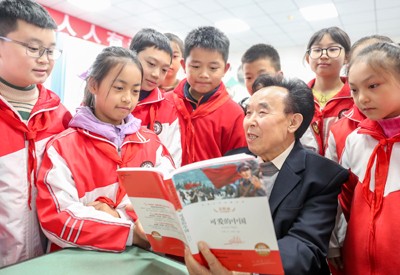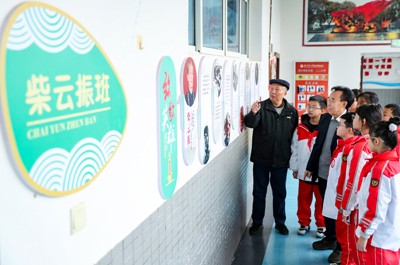 文阳清(左二)等爱心人士在广安启睿第一实验学校与“柴云振班”的学生共同重温柴云振的英雄事迹。(邱海鹰/文图)