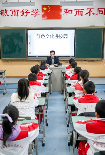 文阳清在广安启睿第一实验学校“柴云振班”对学生进行红色文化教育。