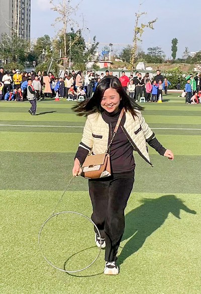 2024年11月27日,四川省广安市加德学校小学二年级二班的家长在参加趣味运动“亲子滚铁环”。