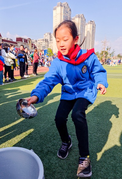 2024年11月27日,四川省广安市加德学校小学二年级二班的学生在参加趣味运动“运水”接力。