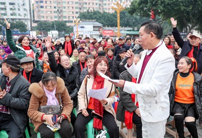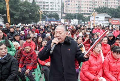 2024年12月2日,四川省广安华蓥市的宪法宣传志愿者,在华蓥山广场为市民展演法治文艺节目。