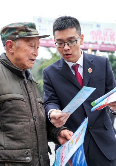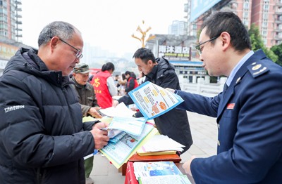 2024年12月2日,四川省广安华蓥市的宪法宣传志愿者,在蓥城街头向市民发放宪法等法治知识宣传资料。(邱海鹰 刘南贤)