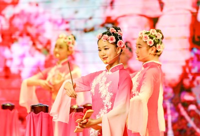 2024年12月6日,四川省广安华蓥市的学生在教育学术年会上,表演具有地方特色的曲艺节目《华蓥清音——双枪传奇》。