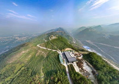 2024年12月18日,鸟瞰四川省华蓥市在退矿复垦地和荒山荒坡发展起来的集生产、加工、产品展示于一体的综合型产业基地——华龙街道柏木山油樟产业园。
