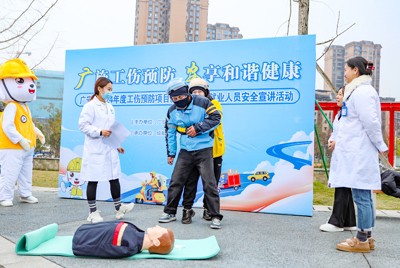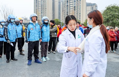 2024年12月20日,在四川省广安市社会保险局开展的“社保规划师新春走基层”系列主题活动中,医疗志愿者在给美团、饿了么、京东等新业态从业人员,演示工伤伤情处理等知识。
