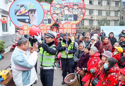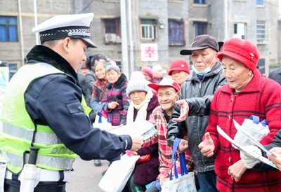 2024年12月23日,四川省华蓥市公安局交通警察大队的民警在天池镇华光社区,给居民发放年关节点交通安全宣传资料。(邱海鹰 陈 敏/文图)
