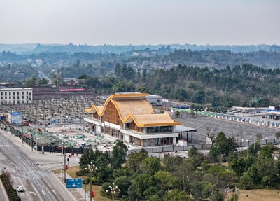 2025年2月10日,鸟瞰四川省广安华蓥市已竣工陆续投入使用的集游客中心、旅游商品展销中心和生态停车场、载客直升飞机停机场及车辆维修、充电等于一体的旅游集散中心(华蓥客运枢纽中心站)。