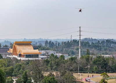 2025年2月10日,一架载客直升飞机在四川省广安华蓥市已竣工陆续投入使用的集游客中心、旅游商品展销中心和生态停车场、载客直升飞机停机场及车辆维修、充电等于一体的旅游集散中心(华蓥客运枢纽中心站)上空飞行。(邱海鹰)