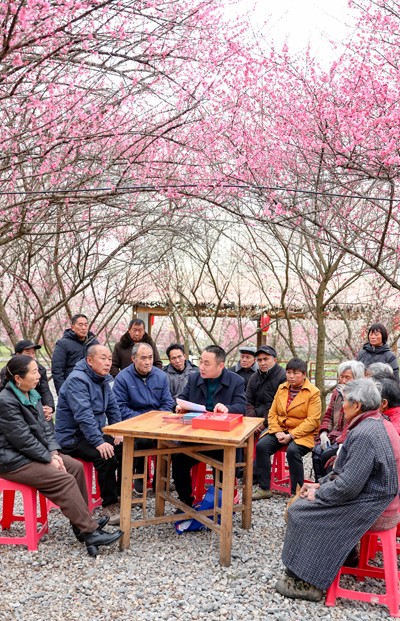 2025年2月11日, 四川省华蓥市禄市镇凉水井村的法律顾问胡平(中)与该村的许永平等“法律明白人”,在村头的生态园组织业主和务工村民学习相关法律知识。