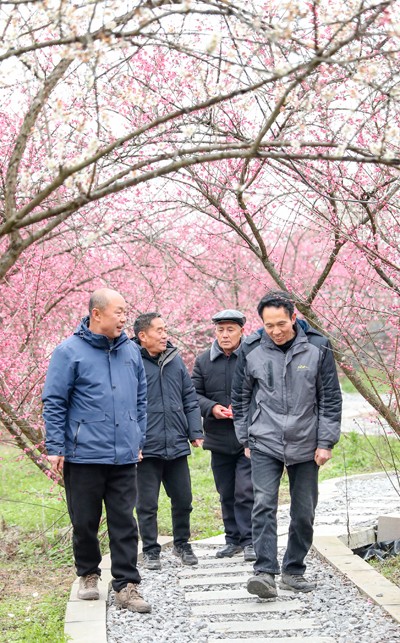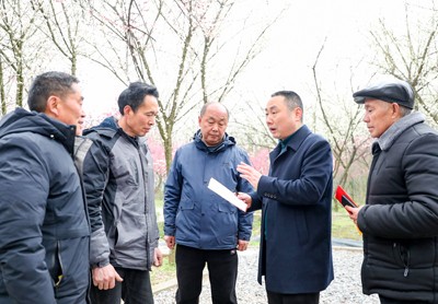 2025年2月11日, 四川省华蓥市禄市镇凉水井村生态园的业主王晓龙(左二),向本村“法律明白人”许永平(左一)等人介绍相关纠纷调解后产业正常发展情况。