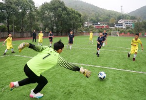 2022年11月15日,四川省华蓥市天池镇小学参加足球模拟比赛的学生在绿茵场上飞身扑球。