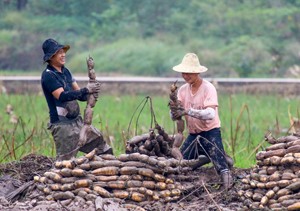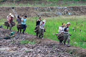 2022年10月29日,四川省华蓥市永兴镇大佛山村村民,在转运刚从田间采挖的以每公斤6元的价格销往贵州的“订单藕”。