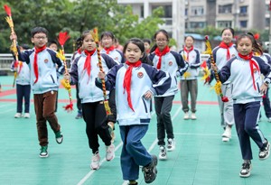 2023年11月15日,四川省华蓥市双河二小的学生利用课间10分,来到教室外练习传统文化“打连响”。(邱海鹰 刘南贤)