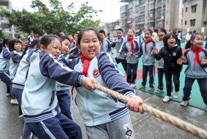 2023年11月15日,四川省华蓥市双河二小的学生利用课间10分,来到教室外参加趣味活动“拔河”。