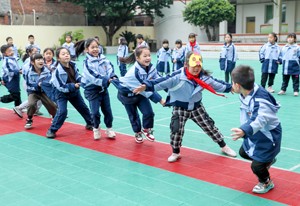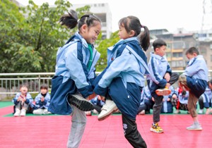 2023年11月15日,四川省华蓥市双河二小的学生利用课间10分,来到教室外参加趣味活动“斗鸡”。