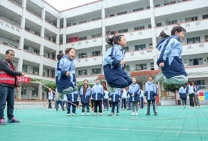 2023年11月15日,四川省华蓥市双河二小的学生利用课间10分,来到教室外参加趣味活动“跳绳”。