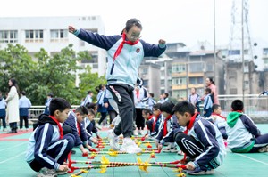 2023年11月15日,四川省华蓥市双河二小的学生利用课间10分,来到教室外参加趣味活动跳“竹竿舞”。